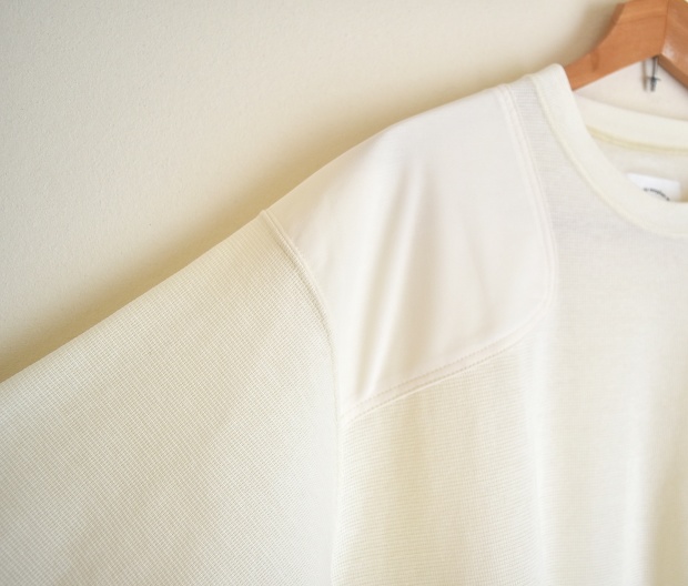 サラッとした肌触りのサーフニット。コマンドセーターに見られるディティールをモディファイしたミリタリーサーマルロングスリーブです。ショルダー部分にはマットな光沢が上品なビンテージジョーゼットスムースを配置し補強とストレッチ性を強化しています。袖口はやや広めにとり、ロックで処理されているのでルーズ感がありながらスッキリとした見栄えです。無地ライクなアイテムで素材の組み合わせで雰囲気あります。